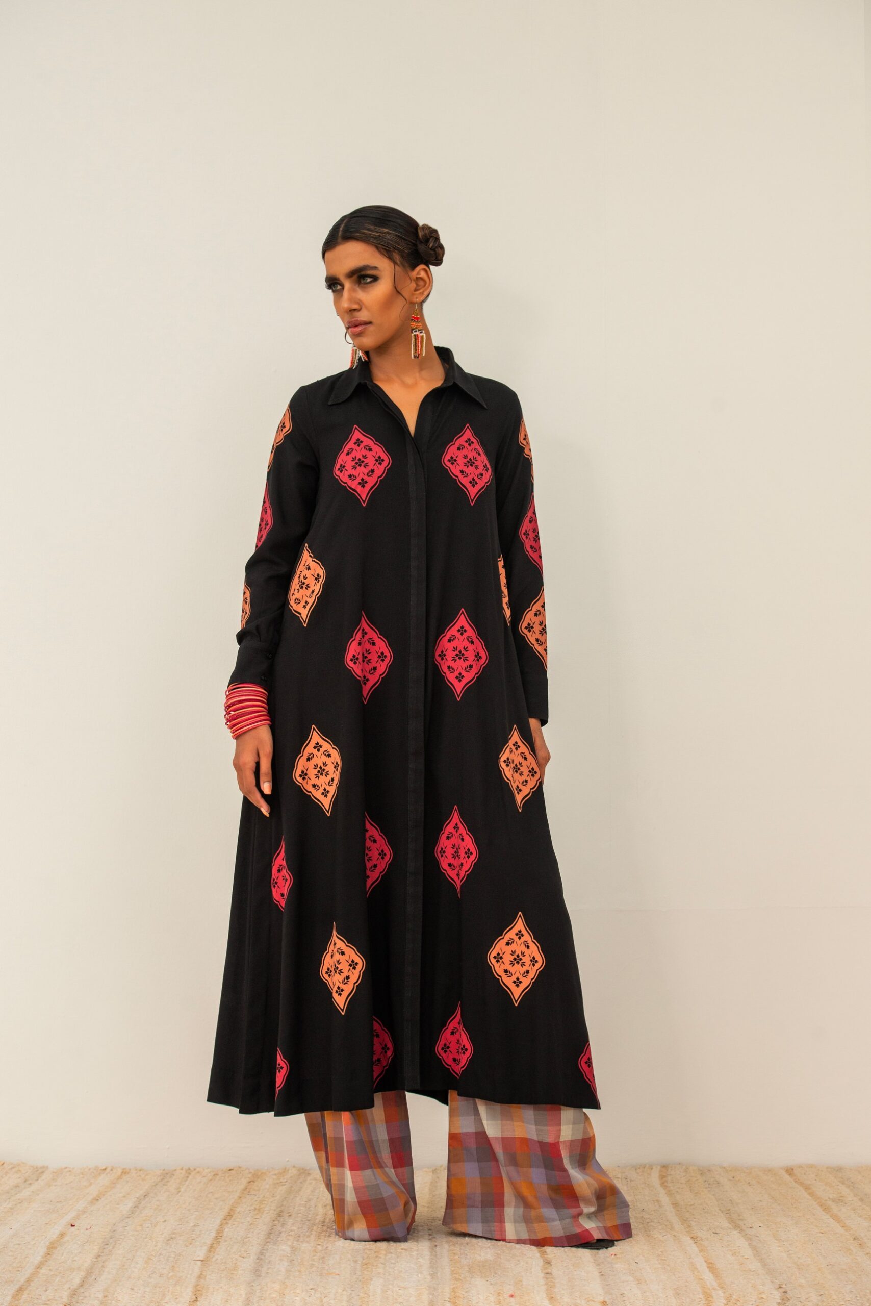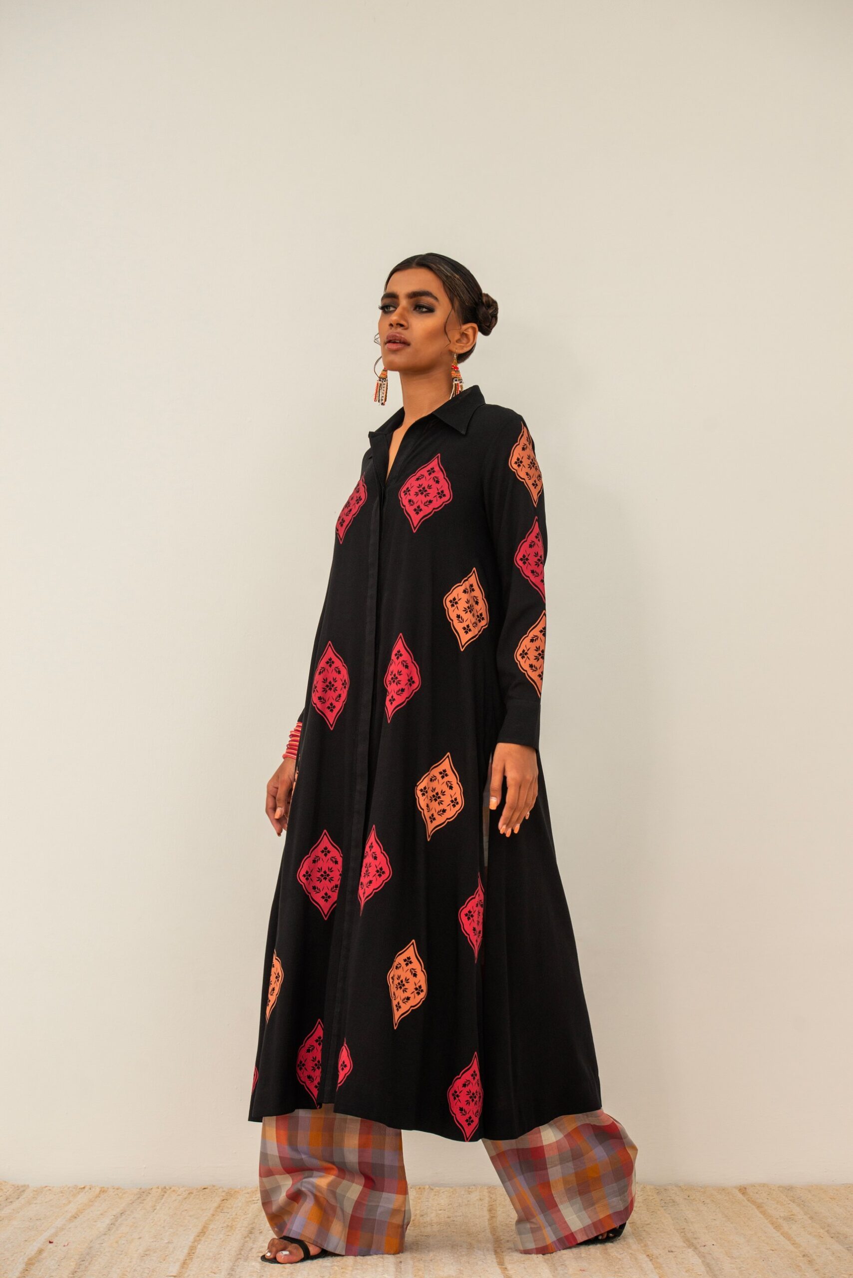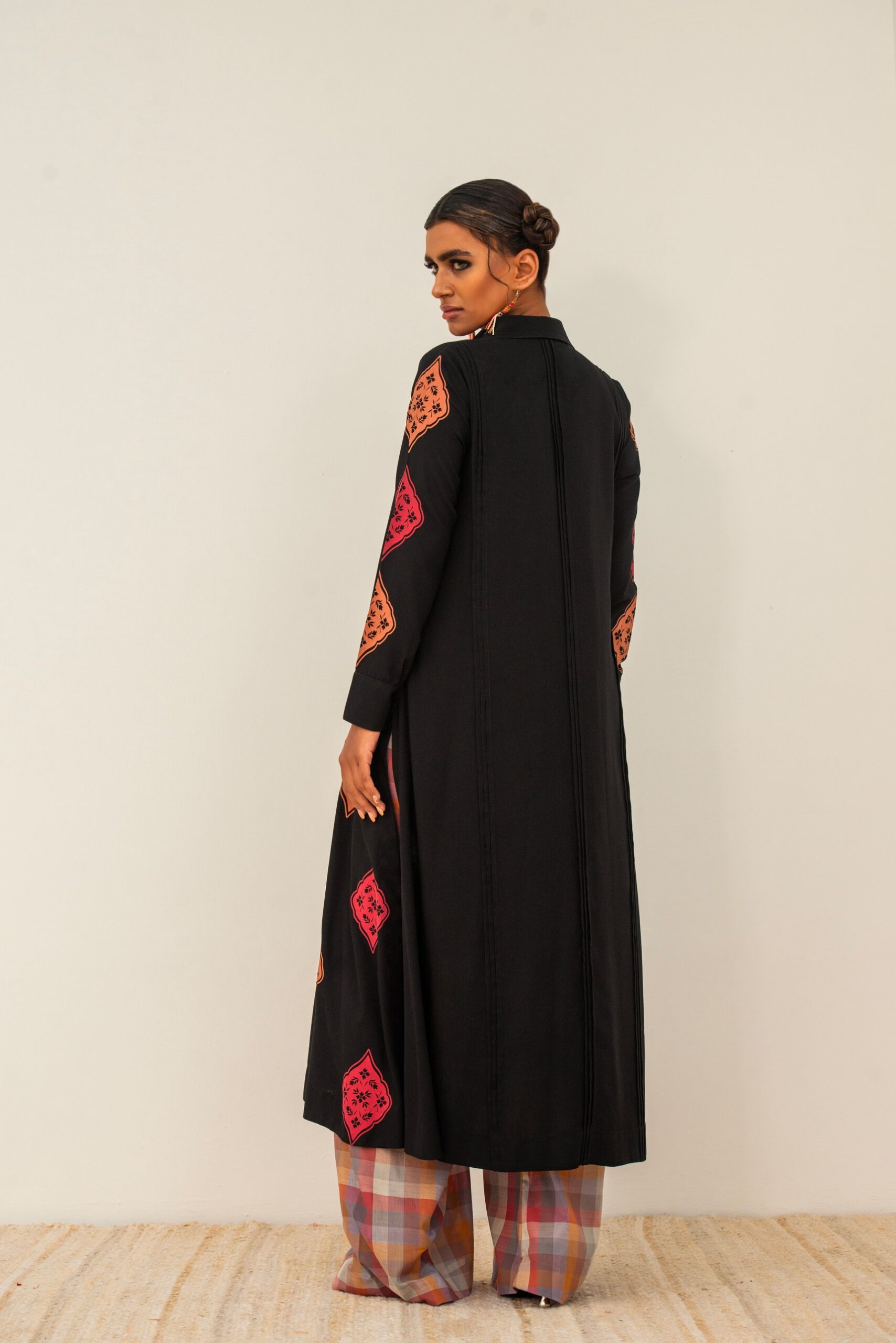 | A front open long shirt on black cotton base with hand printed motis; paired with printed checkered ajar. |