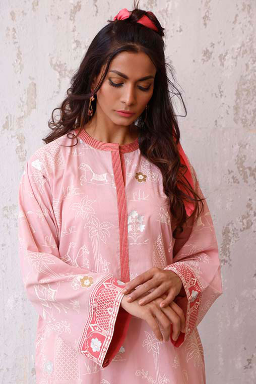 A loose cut tunic, intricately hand printed in off white, gold & silver on pink cotton.