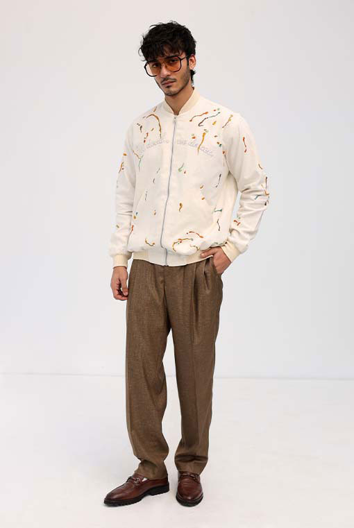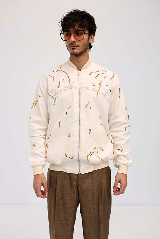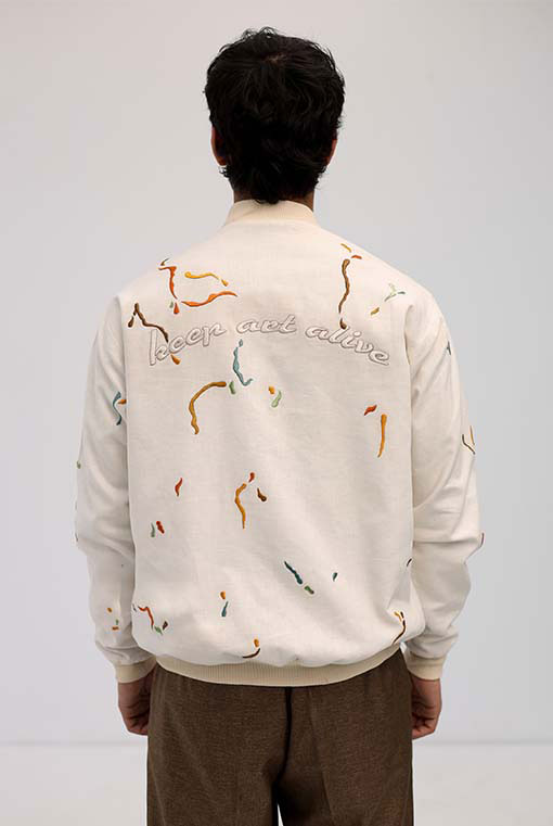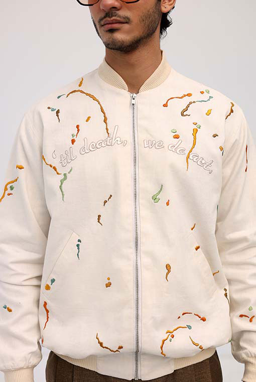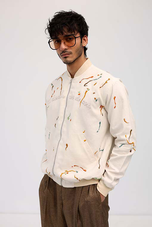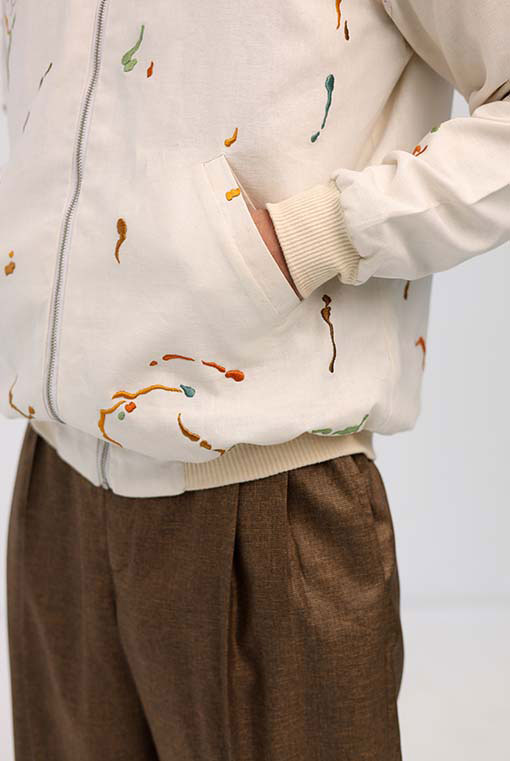 A summertime essential, this Irish cotton bomber jacket is artistically embroidered as splatters of paint to preserve the artwork