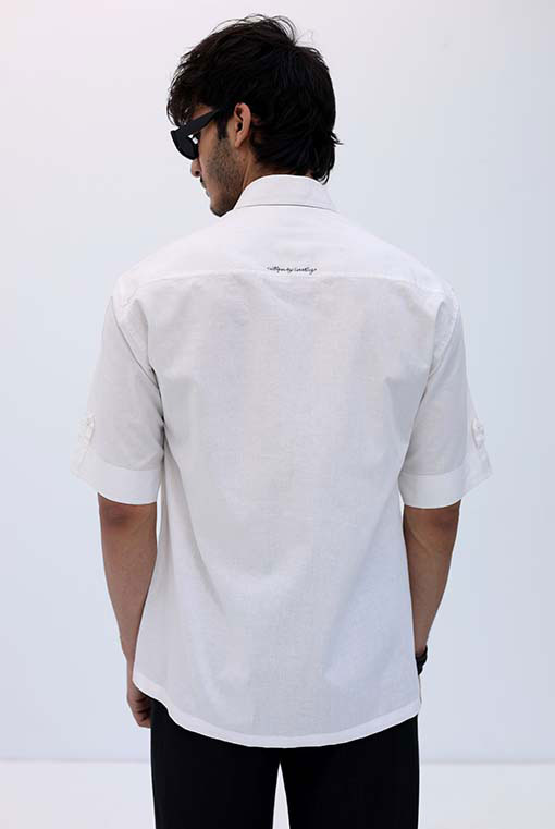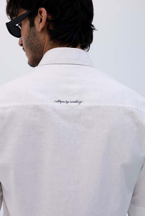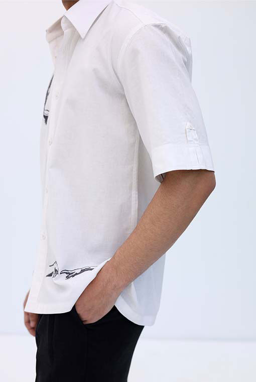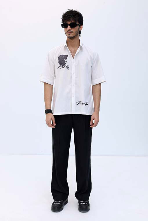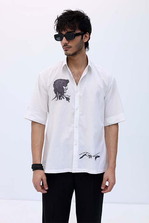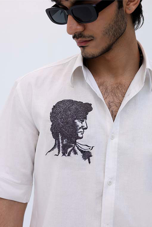 A sketch-style embroidery on a white cotton shirt that symbolizes Michelangelo’s famous artwork