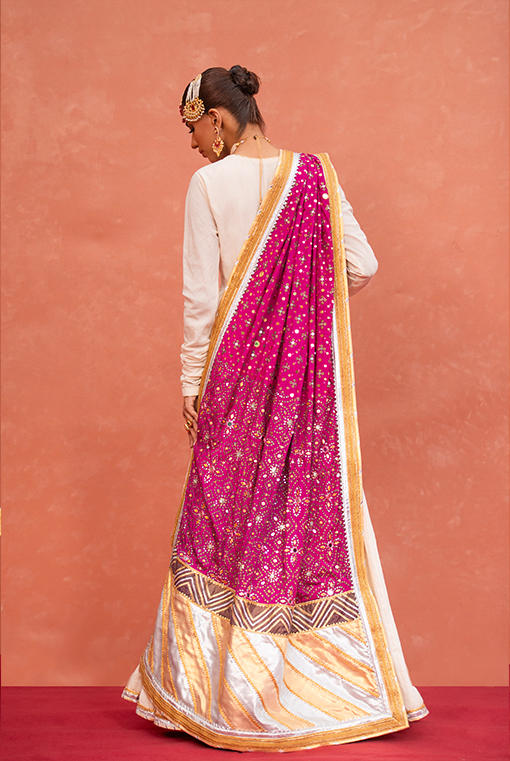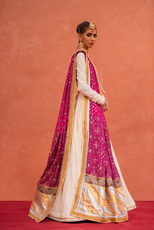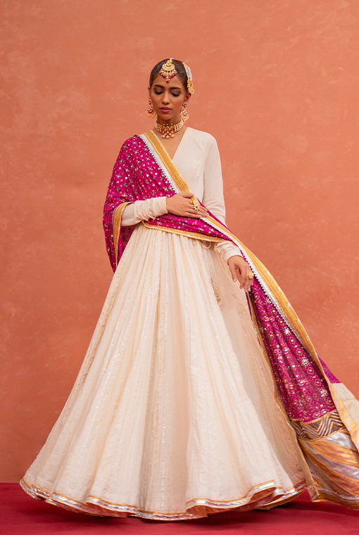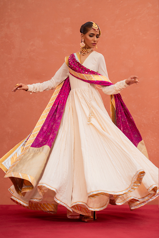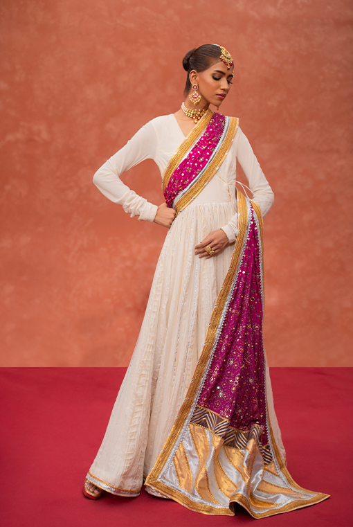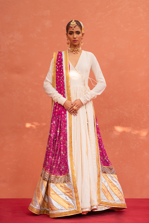 An off white crushed angarkha with a striking combo of gold & silver, paired with hand printed & embellished dupatta.