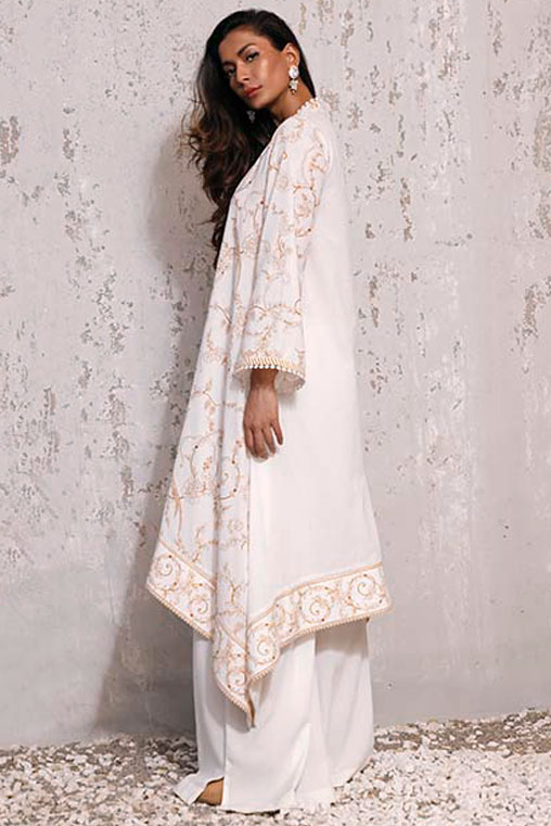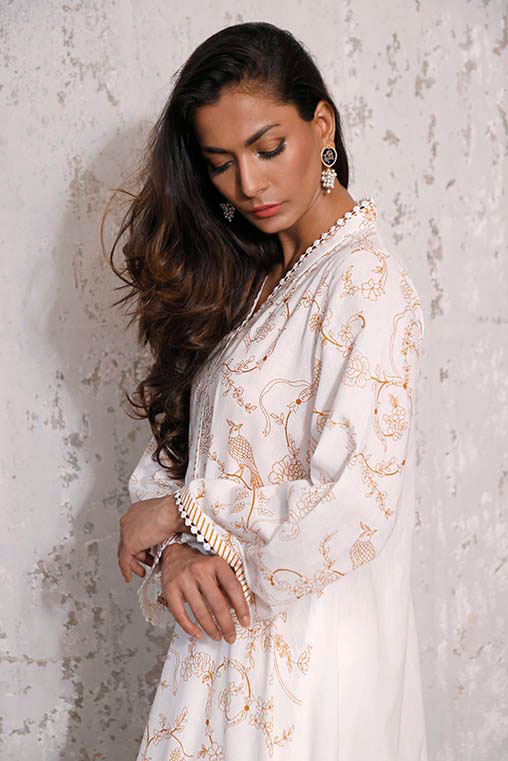 An easy breezy bias cut long shit, beautifully hand printed in orange on white cotton lawn.