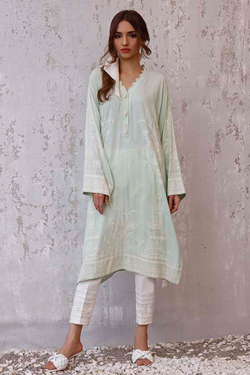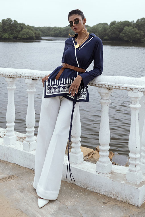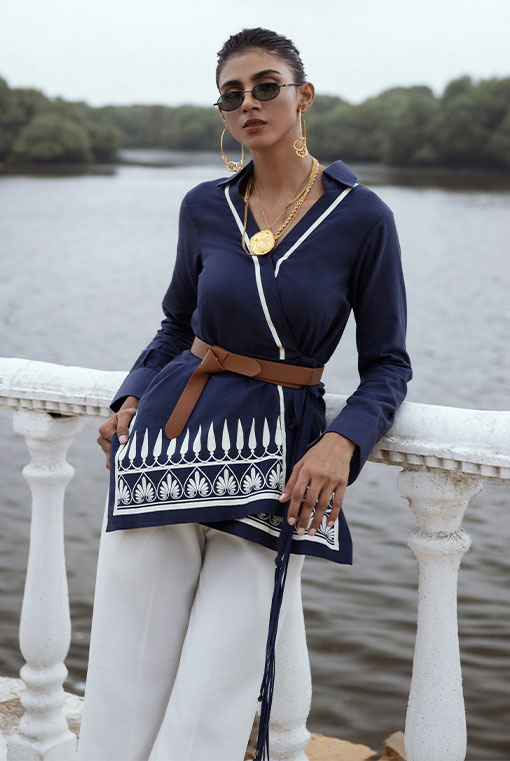 An Irish cotton overlap short top with hand printed greek designs.
