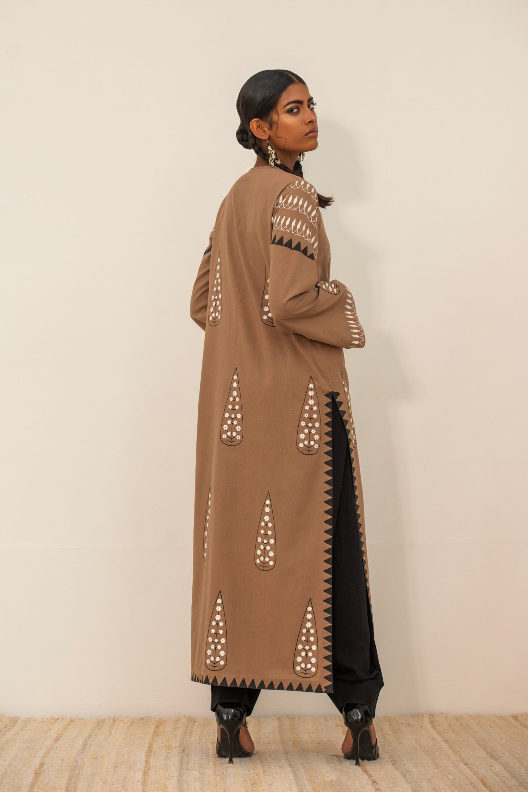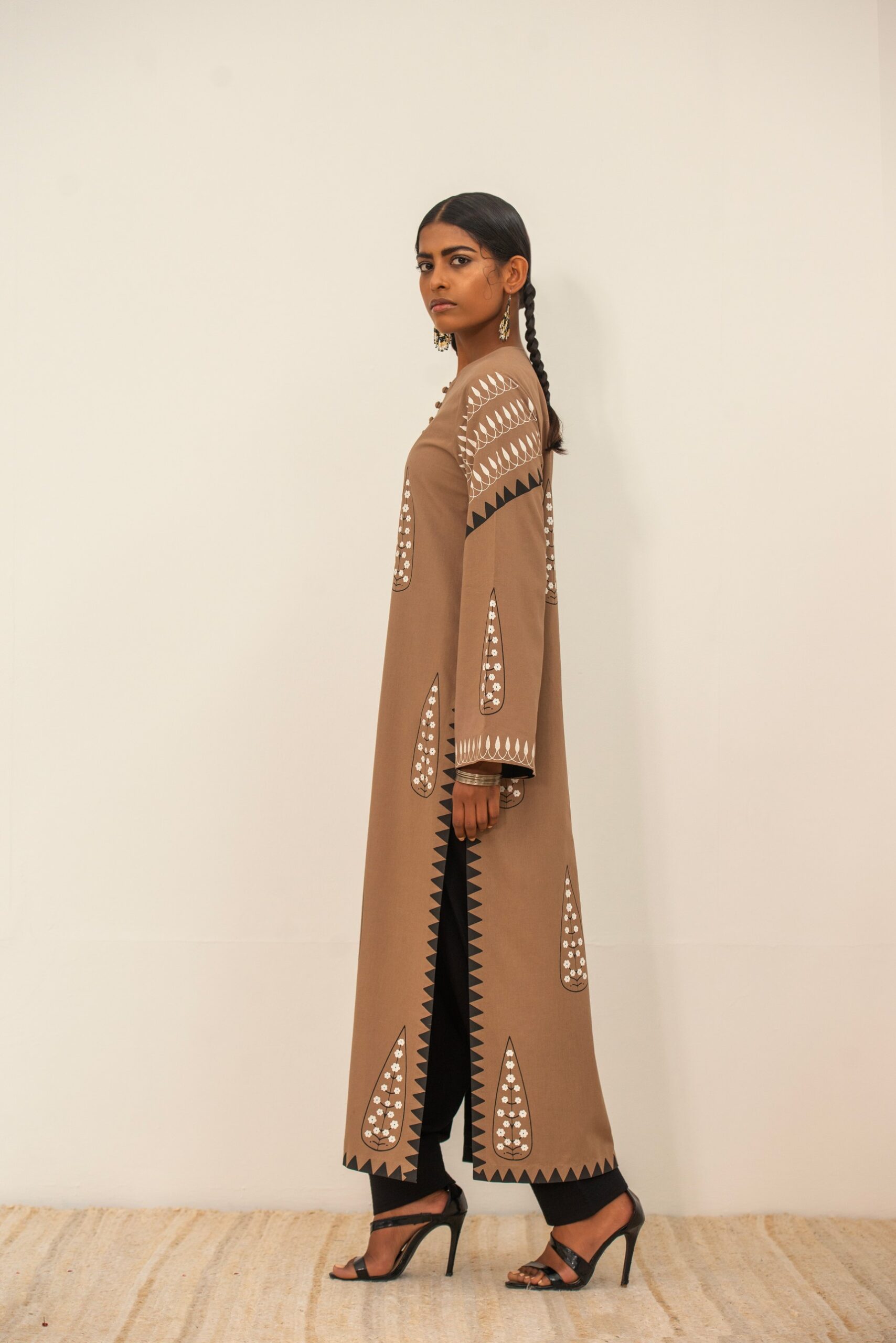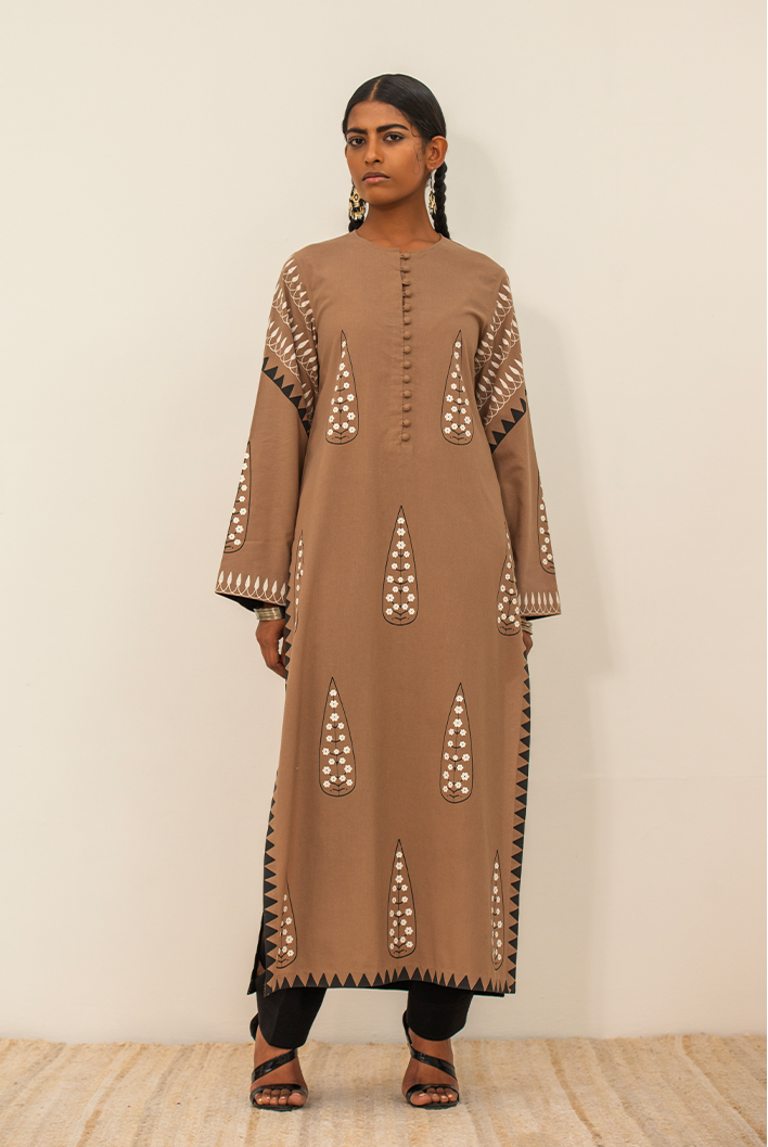 | A simple straight cut tunic on camel brown cotton base with hand printed motis; paired with black shalwar. |