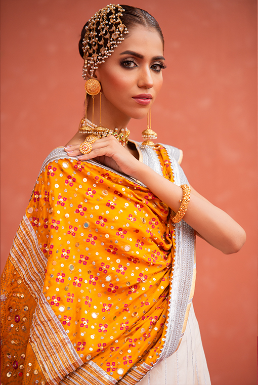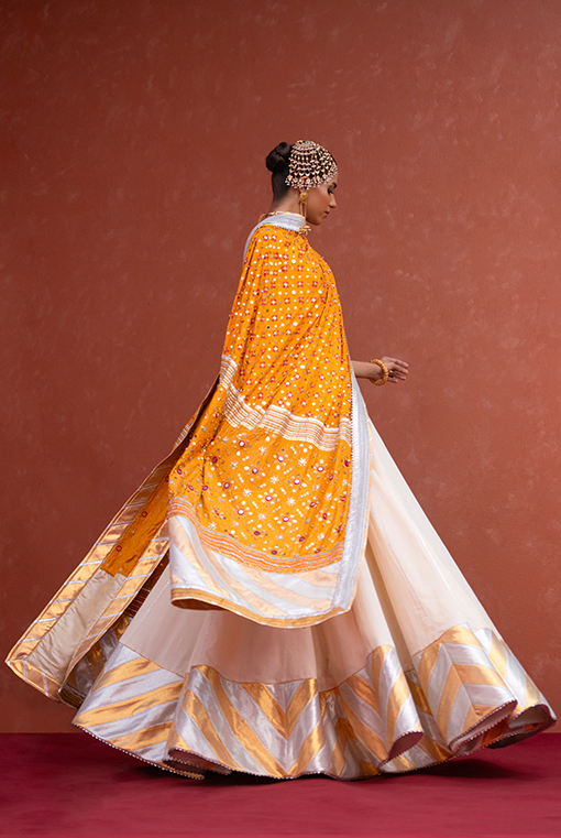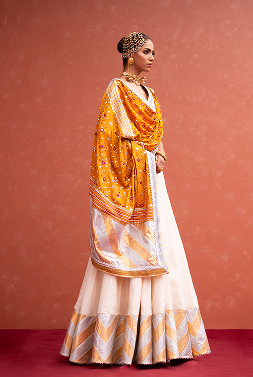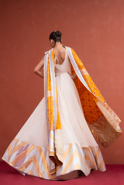 | An off white floor length anarkali with a striking chatapatti of gold & silver, paired with hand printed & embellished dupatta. |
