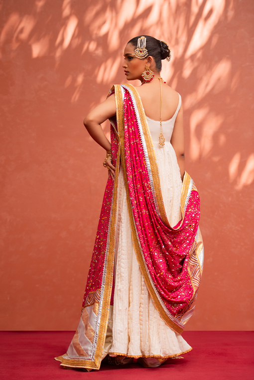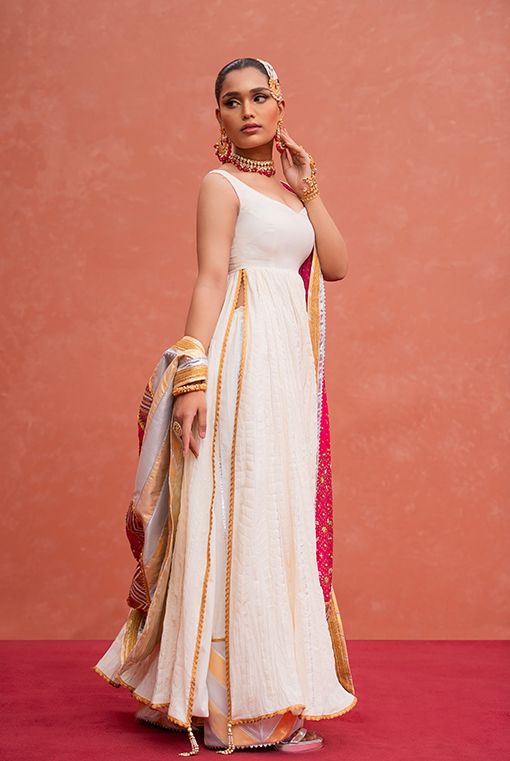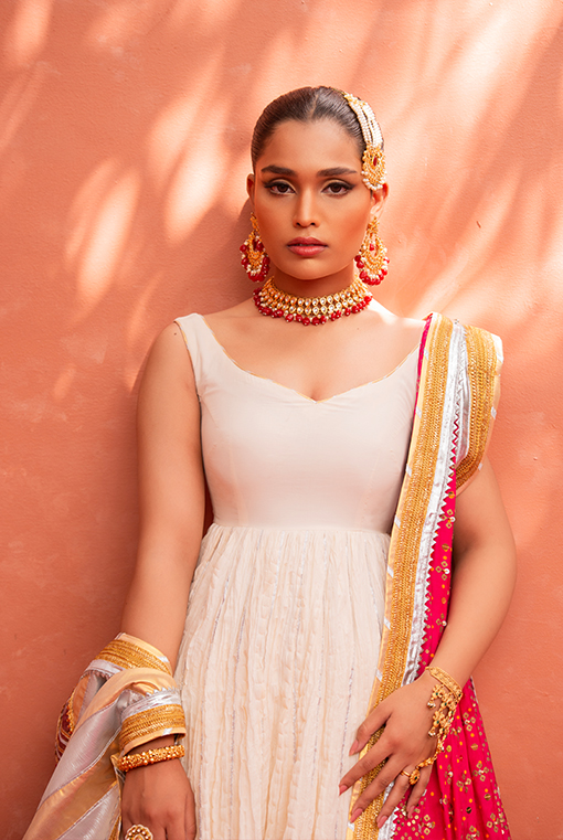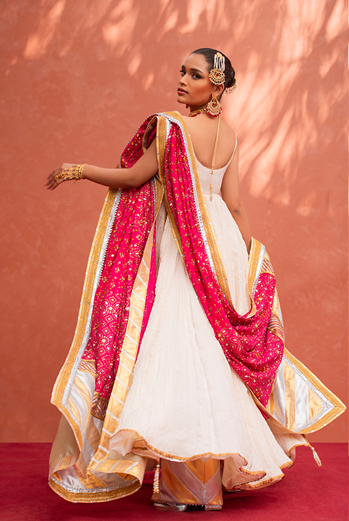 | An off white crushed shirt with a striking chatapatti of gold & silver on trouser, paired with hand printed & embellished dupatta. |